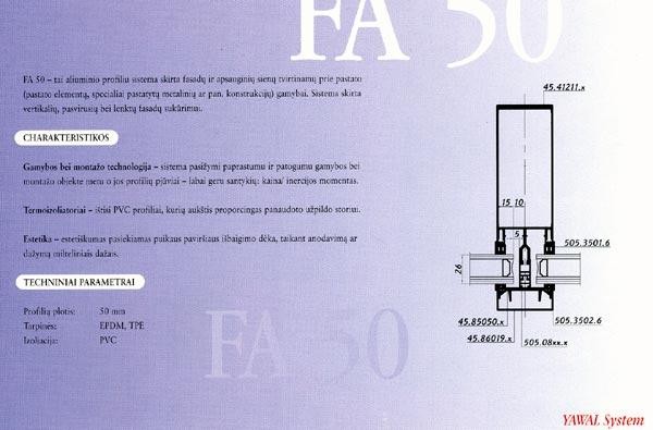 Šios sistemos profiliai yra 50mm pločio, o gylis priklauso nuo fasadinės konstrukcijos dydžio. Spalva parenkama pagal RAL spalvų paletę.